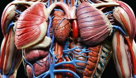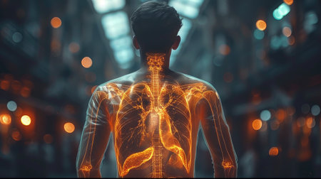 3D medical health illustration of a person's torso and lungs, view of human internal organs, the structure of the human body, blood vessels, AI-generated