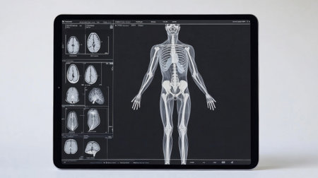 Transparent tablet showing D anatomical model and real-time health diagnostics