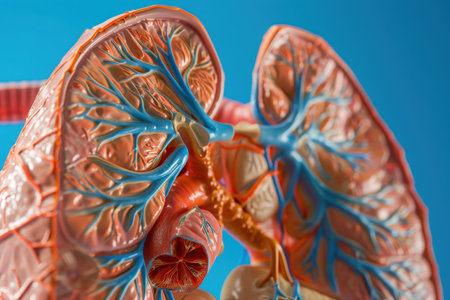 A close up of a human lung with red, blue and pink veins. The lung is shown in a 3D model, with the red veins representing the blood vessels that supply oxygen to the lung tissue
