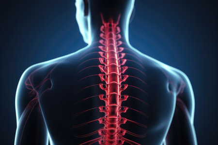 Vivid representation of acute pain in a spinal structure with highlighted red areas indicating fibromyalgia.