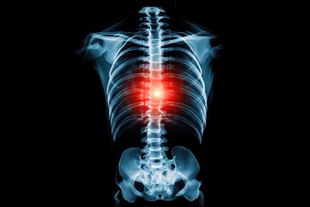 Close-up X-ray of a human back with detailed spine structure. High-resolution radiograph of vertebral bones. Concept of orthopedic diagnostics, spinal health, and anatomical precision.