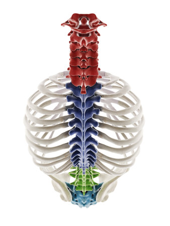 Thoracic vertebrae in red color with body 3D rendering illustration isolated on white with copy space. Human skeleton and spine anatomy, medical diagram, osteology, skeletal system concepts.