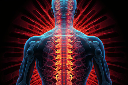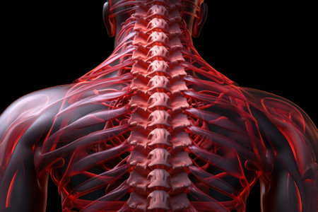 Human Back With Red Highlighted Skeleton for Anatomy Study and Education, Human spine visualising pain with red and orange colours, AI Generated