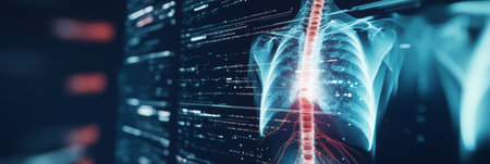 This X-ray image showcases the human spine and rib cage with intricate details of vertebrae and nerve pathways, ideal for medical and educational purposes.