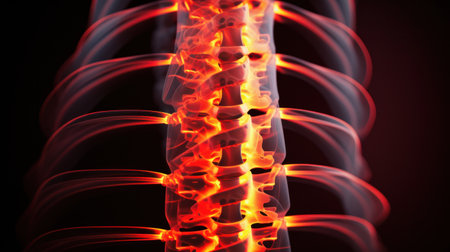 spine, anatomy, medical illustration, human body, biology, glowing effect, dark background, spine structure, vertebrae, health depiction, organic shapes glowing, blue and orange tones
