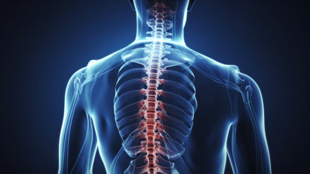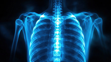A digital illustration of a human spine and rib cage with a blue glow on a dark background, highlighting the structure of the torso. spinal health in overall well-being. High quality photo
