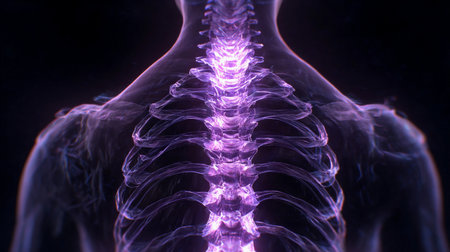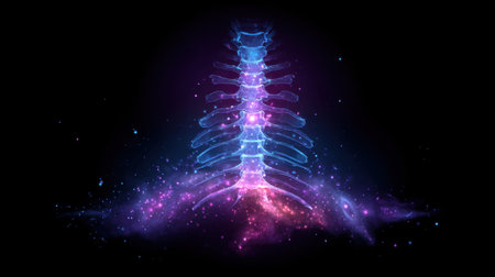 Digital representation of a vibrant human spine illuminated with purple hues against a dark backdrop during a visual exploration of anatomy and health technology