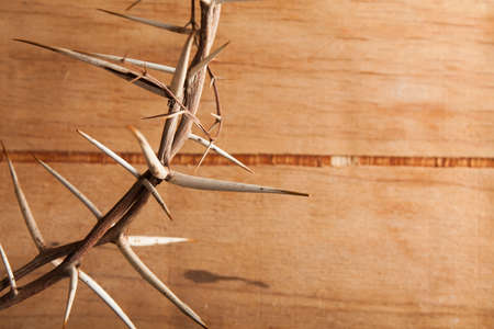 Crown of thorns with blood on wood desk