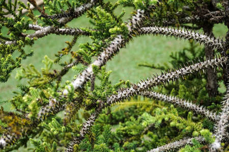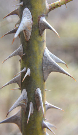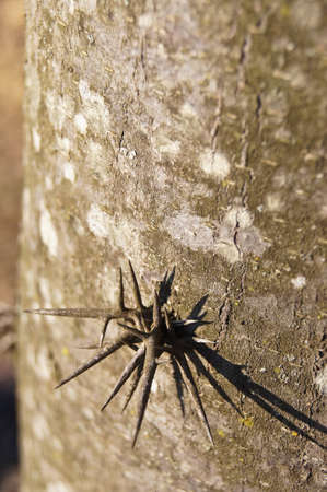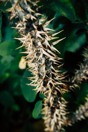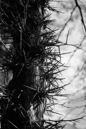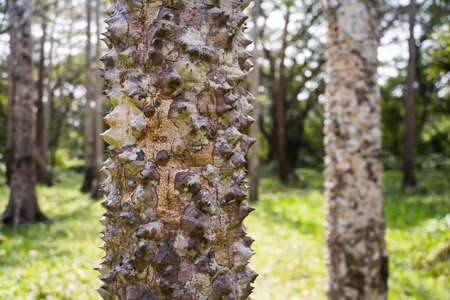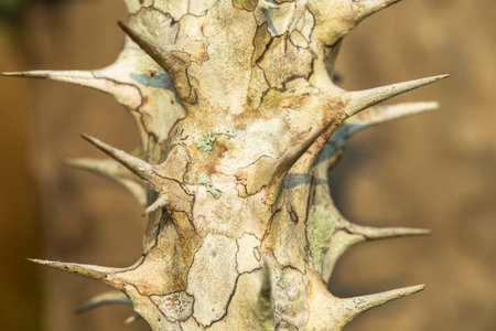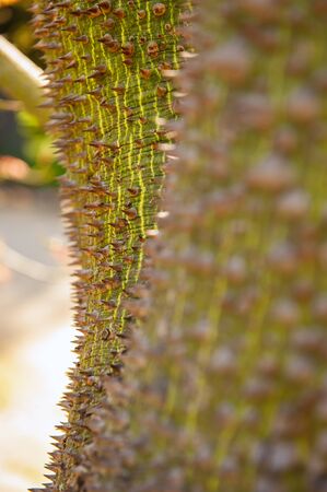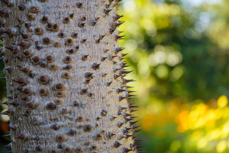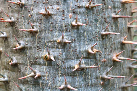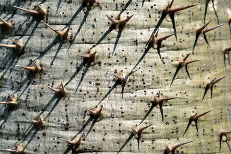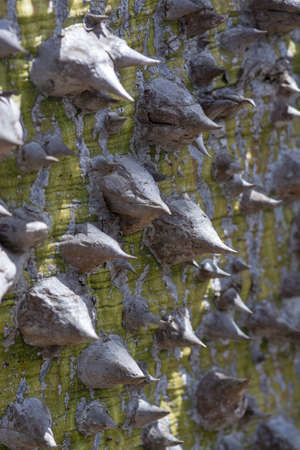 Chorisia tree trunk with aggressively sharp thorns closeup macro photo