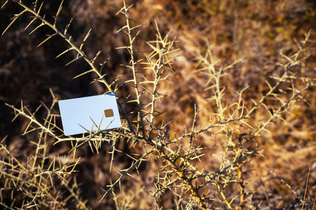 White Plastic Card Lies Among Dry Thorns. The Concept Of Paying For Nature And Green Economy.