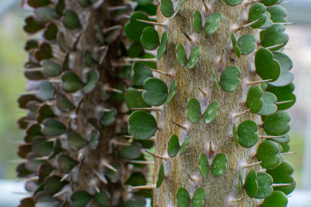 Madagascar palm tree spikes, Pachypodium lamerei stem with long needle type thorns, spine-bearing trees