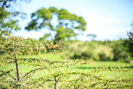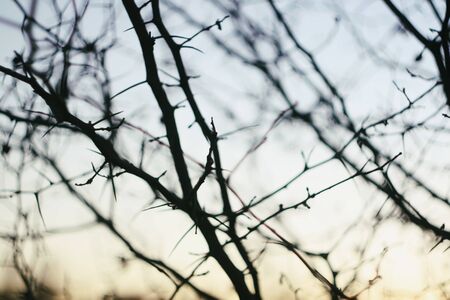 Thorns on bare twigs of tree in spring sunny day on blurred background