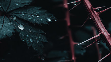 A macro photograph capturing the contrast between a sharp thorny branch and a soft dark leaf covered in glistening water droplets creating a mysterious and moody atmosphere.