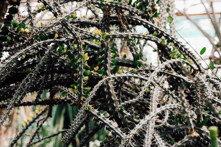 Thorny Succulent Stems in Sunlit Greenhouse Close-Up