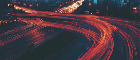 Stunning aerial view showcasing a complex highway interchange illuminated by vibrant light trails. The image captures the energy and motion of urban life.