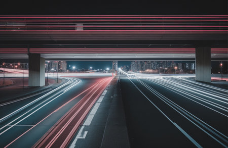 Capturing a vibrant highway scene at night, this image presents bright street lights and stunning light trails, reflecting the dynamic energy of urban life.
