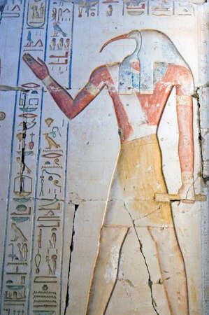Large painted carving of the ancient egyptian god Thoth. Depicted with the head of an ibis bird, Thoth is the god of wisdom and writing. Wall at the ruined Temple of Ramses II at Abydos, Egypt.