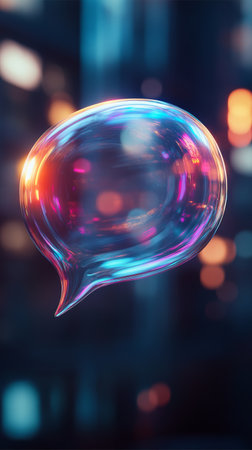 Colorful translucent speech bubble with neon lights against blurred city background, futuristic communication concept