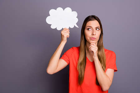 Photo of pretty lady holding paper mind cloud cant find words for advertisement banner text deep in thoughts wear casual orange t-shirt isolated grey color background