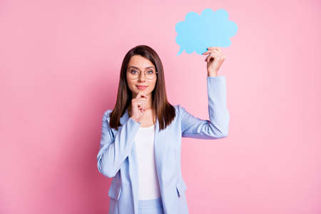 Photo of young attrective woman hold mind paper cloud think deep imagine plan isolated over pastel color background