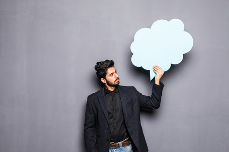 Young indian business man holding a bubble for text, isolated on grey background