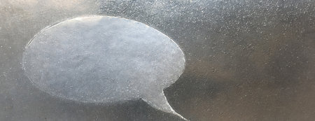 Frosted glass speech bubble cutout on a scratched metallic surface, concept communication. Panorama with copy space against gray texture..