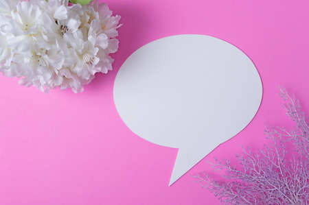 Speech symbols made of paper and flowers placed on a pink background.