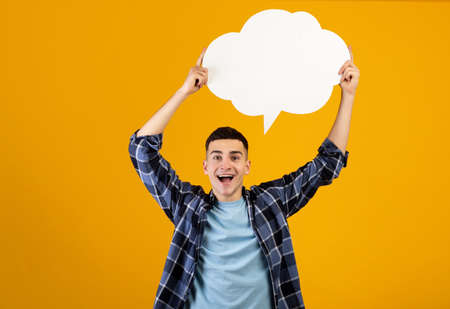 Excited millennial man holding empty speech bubble above his head over orange background, mockup for your ad or design