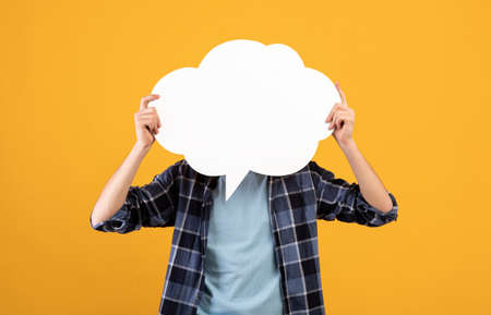 Unrecognizable young man holding blank speech bubble in front of his face over orange background, mockup for design
