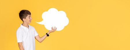 A young boy with a smartwatch playfully holds up a blank speech bubble sign
