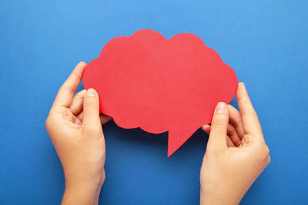 Hands holding an red empty speech bubble on blue background. Top view