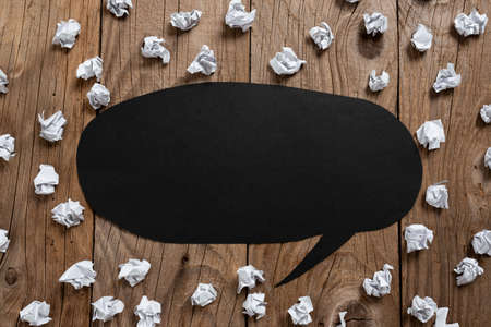 Speech Bubble On Floor With Important Information Written In With Paper Wraps Around. Dialogue Balloon On Ground With Crutial News Inside And Crumpled Notes All Over.