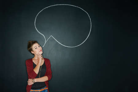 Whats your truth. Studio shot of a young woman posing with a chalk illustration of a speech bubble against a dark background.