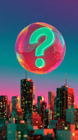 A large, colorful question mark is floating above a city skyline at sunset or sunrise with skyscrapers in the background and pinkish-purple sky behind it.