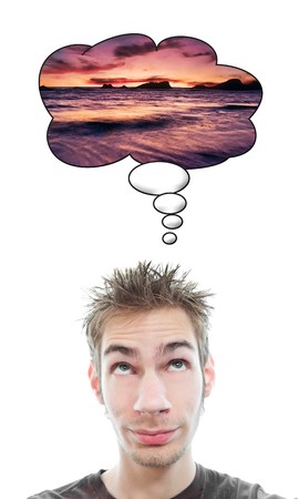 Young adult white Caucasian man thinks about a beach on a vacation