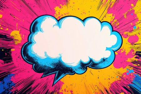 Blank comic book speech bubble is exploding out of a colorful halftone background