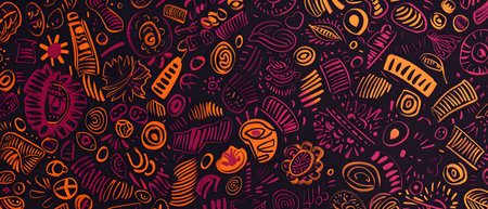 This image features a doodle page print border design with a rich and vibrant background of stylized Adinkra symbols in a color palette of plum marigold and charcoal The central space is left blank