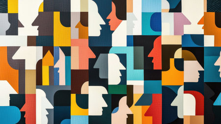 This vibrant abstract artwork portrays diverse human faces surrounded by geometric shapes and bold colors, emphasizing themes of community, connection, and identity.