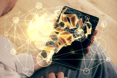 Double exposure of man's hand holding and using a digital device and brain hologram drawing. Data concept.