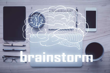 Multi exposure of creative drawing over table with phone. Top view. Concept of startup.