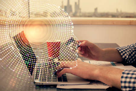 Double exposure of man hands typing on computer with credit card and brain theme drawing. E-commerce and AI concept.