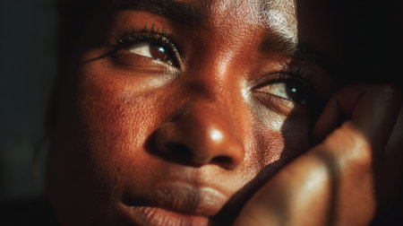 Close-up of pensive young African female face in sunlight.