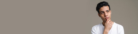 Thinking hispanic man in t-shirt posing and looking aside isolated over grey background