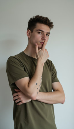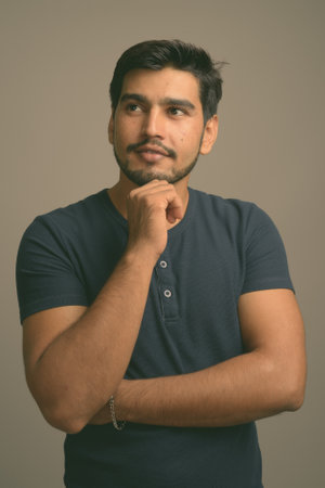 Bearded handsome man standing with hand on chin. Handsome tattooed man in black t-shirt standing with hand on chin and looking at camera on grey background. Gesture concept