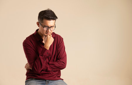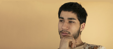 Portrait of thoughtful young man who looks away and touching his chin and weighs the pluses and minuses of the offer isolated on white background with copy space.