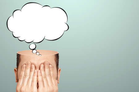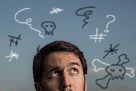 The man thought about it, a sketch of the Cloud Bubble hangs over his head. The concept of dreams, thoughts, idea. Close-up portrait. Creative background, copy space