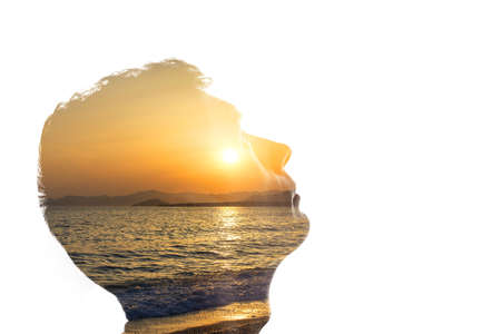 Beautiful double exposure of a human silhouette with ocean landscape and sunset. This artistic image represents tranquility, mindfulness, and nature