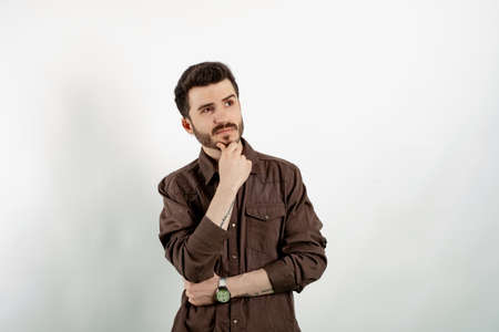 Caucasian man wearing brown shirt posing isolated over white background thinking and touching chin while looking aside. Solution of problem. Looks up, makes up an idea.