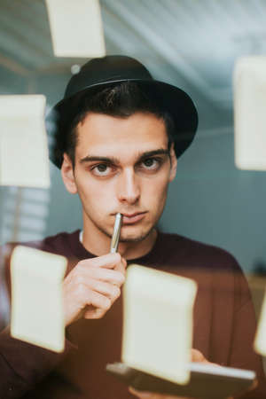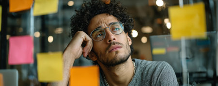 Thoughtful man with glasses looking at colorful sticky notes on glass wall in modern office environment