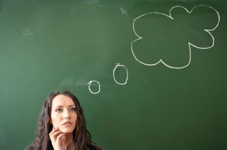 woman over blackboard with funny cloud picture